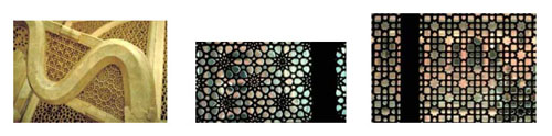 The other effects include inscriptions from the Quran in bas relief panels in brown marble, as well as an intricate patterns cut into panels of lime stone to form perforated screens. (Please refer to the accompanying figures):