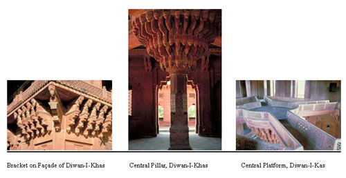 Even more interesting features abound in the interior of Diwan-I-Khas. The spacious hall’s main attractions are the central octagonal pillar with a full head of brackets (36 in all), with exquisite pillars wih a full head of brackets (36 in all) with exquisite carvings that form “aquatic” brackets at the corners. A circular platform rests on top of the central pillar and corridors connecting this platform to the corner “quarter” platforms. The corridor is lined by intrinsically patterned fencing.