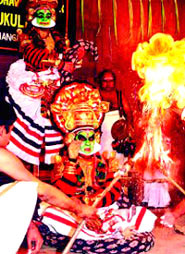 This is a ritual dance drama played during festivals in temples of the Goddess, often considered as a subdivision of Theyyam but with differences in costumes, rituals, music, make-up and performances. Traditionally it is the right of one community, the Vannaans. Like the Thiyyam, the characters assume the roles of divine personalities. The dance takes place at night under the light of torches and has indigenous instruments as accompaniments. Unlike Theyyam the Kolam or the attire of the Thira dancer can take up various manifestations. Like in Kathakali the make-up is elaborate and time consuming. The eyes are blackened with 'mashi' with details and a reverence than in any other theater art. There are traditional rituals and meticulous details that are observed before the actual performance of Thirayattam. During the play, there are many stages and the artist changes the costume to enact the various roles. The climax involves the ritual called 'urayal' where the performer goes into a trance, shaking, shivering and dancing vigorously.
