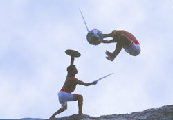 Kalaripayattu is the 2000-year-old, martial art style of Kerala, still existing, and representing the traditional valiant, physical and cultural character of the state. In recent years it may have even gained more popularity outside the state and the younger generation showing interest to learn the technique. Perhaps styles like Karate and Kung fu, may trace their origin to Kalarippayattu as the Buddhist monk Bodhidharma took the tradition to the Far East. The art is described in Vishnu Puranam of Dhanur Veda and thus is very much a part of Hindu religious traditions. The legend goes that the warrior saint Parasurama, an incarnation of Vishnu created the art form after he reclaimed the land of Kerala from the seas by throwing his axe. He also established forty-two 'kalaris' and trained twenty-one gurus to teach. Kalari means a court related to war and payattu is the skill of fighting.