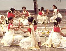 Kaikottikkali, literally the word meaning 'clapping the hands and playing', is also called Thiruvathirakali since it played during the seasons of Thiruvathira and Onam. It is a group dance where in the participants dance clapping their hands in unison and playing to the tunes of songs, mostly from mythological stories, related to romantic or devotional themes, often from Kathakali style. This essentially used to be an entertainment by and for women of all ages where men are not present even as spectators. This is a very popular folk dance performed during festival times, but with modern interest in the traditional art forms, it has found its way into the main stream, and into the college and school art festivals. This is an exceedingly graceful dance form with feminine elegance and allure, 'lasya', being the predominant theme. The costume is very simple, two cotton pieces of white or off white mundu and neriyathu, with colored or gold borders, 'kara'. Their hair is bundled into a tight mass or bun-shape bordered with jasmine flowers. The participants wear simple traditional ornaments and there is practically no make-up except the sandalwood paste and kumkumam on their foreheads. The group usually is in even numbers of 6 to 8 to as many as can be accommodated on the stage or in the open yard. Played in circles, moving rhythmically clockwise or counterclockwise, hands clapping and bodies bent and curved following the traditional choreographic pattern. Many of the movements involve two women clapping hands together and changing partners as they move on in circles. There is usually a nilavilakku, the traditional oil lamp or 'pookkalam', flowers arranged in colorful pattern in the center of the circle.