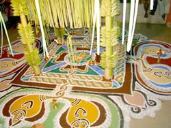 Is the song of Bhagavathi of the Goddess, performed by the Brahmin castes of Kerala, praying for the girls to be married off without delays and obstruction. In the past Namboodiri girls were excommunicated if they eloped with or had an affair with non-Brahmins. The performance is under a canopied roof of cloths and leaves. The ground is decorated in the shape of the temple and the priest chants with the Brahmins singing to the accompaniment of instruments. One woman from the ex-communicated group called 'Pushpakas' will be seated under the canopy who will get into a frenzied trance as the singing and praying continue.