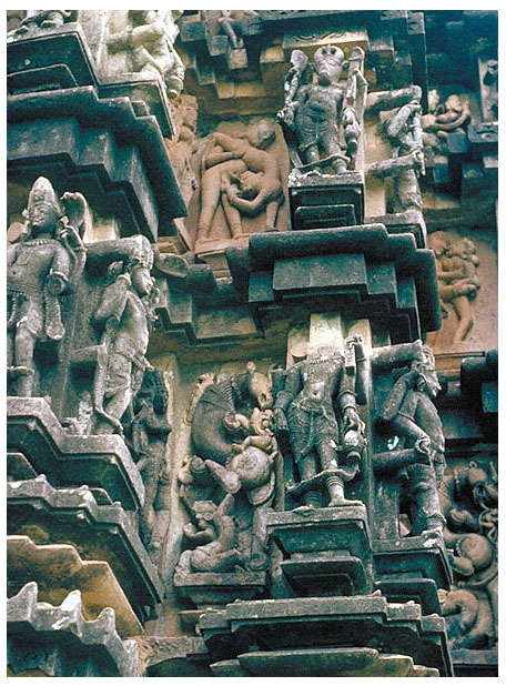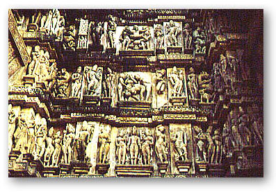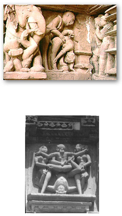 The temples of Khajuraho (near the small town of Jhansi, in Madhya Pradesh) were built over a period of 100years (AD 950-1050), during the reign of the Chandela Rajputs. Although constructed in granite, of the 85 original temples, only 22 have survived. A radical departure from the usual Indian temple construction is placing the temple upon a high masonry terrace, without an exterior wall around the temples. All Indian temples are studded with faces and figures of Hindu deities and depiction of scenes from the Hindu mythology. The Khajuraho temples have a profusion of human figures depicting ordinary lives of the people of that age as well as the Hindu deities. And interspersed in this crowded arena are men and women in every conceivable sexual positions and acts. Artistically rendered, one can only infer that the sculptures (and their benefactors) meant to depict all aspects of their daily life (and not exclude the intimate acts). In doing so, one cannot but infer that both the people were prosperous and liberated (and thus perhaps educated and enlightened) and did not feel inhibited about advertising their sexuality as well.