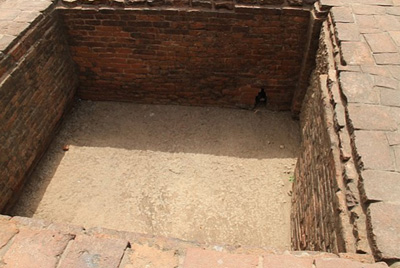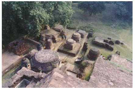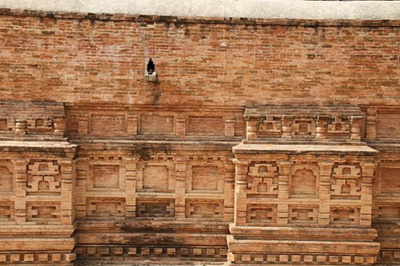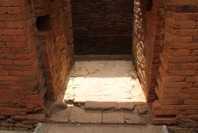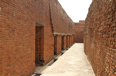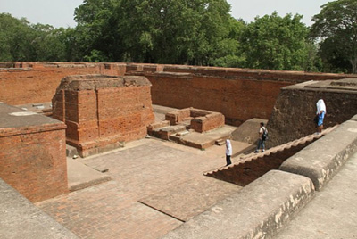 In many respects Nalanda functioned like a modern university. The students had oral exams at the entrance, but no specified duration of courses was adhered to or degrees awarded upon completion of their studies. The subjects varied from mathematics and astronomy to language and grammar and philosophy and theology. A vast library existed in the university but a malicious fire destroyed and left no remnants of the library. The university that flourished for almost 1200 years met destruction at the hands of invading Muslim armies; a detailed description of this destruction was left by the Tibetan pilgrim Dharmasvamin in 1234 AD. The monks fled to Tibet, along with whatever they could save from the monasteries, in 1233. However, the buildings themselves were not demolished and thus still remain and attest to the grandeur of India of the past! The photographs below are from different sections of the university, that are still standing. They are dominated by prayer and meditation halls but, also shown is a lecture hall (you can see some people walking downstairs into the lecture hall),a corridor, students' quarters, a granaary and the remains of a library.