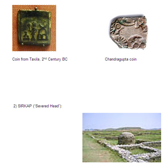 At the time of Alexander the Great’s invasion (326 BCE), Taxila was already a flourishing center of commerce and culture. After Alexander’s departure and the accession of Taxila into the Mauryan Empire of Magadha, it had a resurgence of importance. Particularly during the reign of Emperor Ashoka the Great, Taxila became a great center of Buddhist learning. He built two new Buddhist monasteries to the east of the city; the Dharmarajika monastery where several relics of the Buddha were buried, remains the more important of the buildings, especially the Stupa. In the monastery are a series of small chapels where monks meditated. Also found in this monastery were coins (both gold and silver), gems and other jewelry, some of which are shown below: