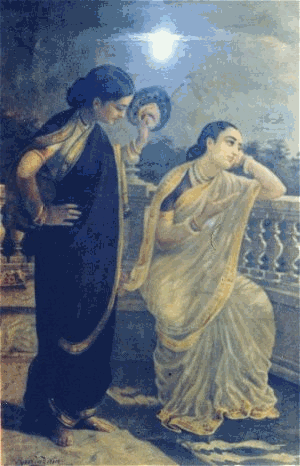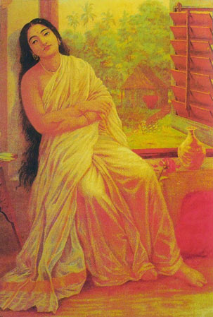vi) “Shakuntala”: A personal favorite of mine, Shakuntala is a star among a bevy of stars created on canvas by Ravi Varma. Not only is this painting a superb example of perfectly executed masterpiece, the despondency depicted in this heroine is quite unique. I adore this painting!