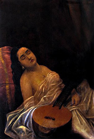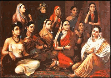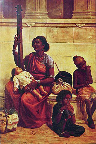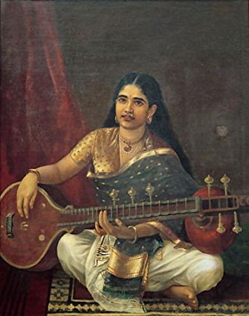 vii) “Musicians of India”: This painting is not a favorite of mine. I do not see the purpose of the painting or the way the characters are spread around the picture as if stacked up on a book-shelf. In fact, the clutter takes away from the technical mastery of Ravi Varma. However, this is a well-recognized painting of the artist.