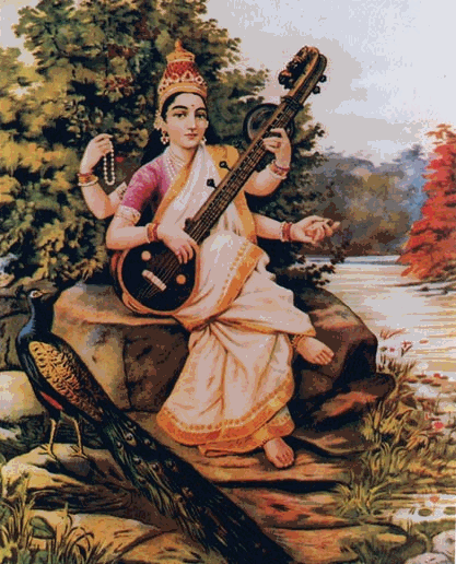 In this segment, I will present a single representative painting of satisfactory image quality I could find on the internet, a favorite of mine as well, Saraswati, the goddess of learning and wisdom: