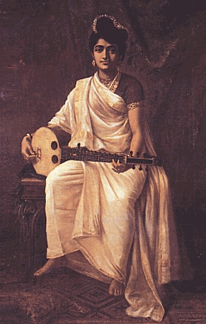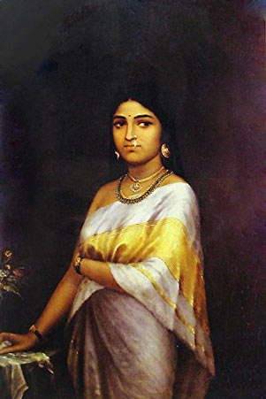 iv) “Malabar girl”: This classic has everything that Ravi Varma is renowned for. If an artist’s ability can be judged by the shape of the hands and fingers (these are difficult for the average artist), Ravi Varma scores big in this painting. The great harmony that the delicate figure of the girl strikes with the pose, the play of the folds of clothing and the subdued glitter of her jewelry all speak volumes for Ravi Varma’s authority over oil painting.