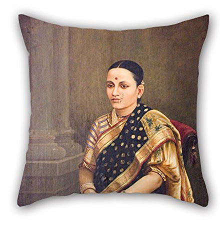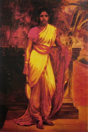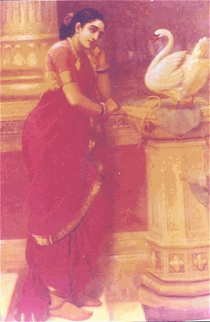 v): “Damayanti”: The most renowned of all of Ravi Varma’s portraits, this painting captures the melancholy of the heroine and adorns it with the simple rendition of sari and its accompaniments. The background, including the swan is in perfect synchrony with the main subject matter.