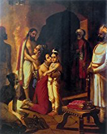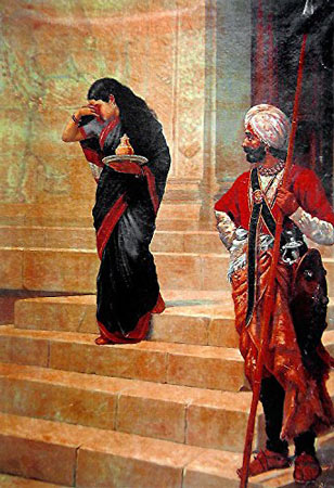 vi) “There Comes Papa”: The perennial favorite theme of mother and child is depicted in this painting by Ravi Varma ever so delicately. Most painters find the subject of a small child difficult to tackle. Not so this artist. What a delight to the eye! The mother’s expression, the clothes and her figure are all exact and thoroughly compliments this true masterpiece.