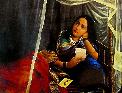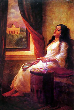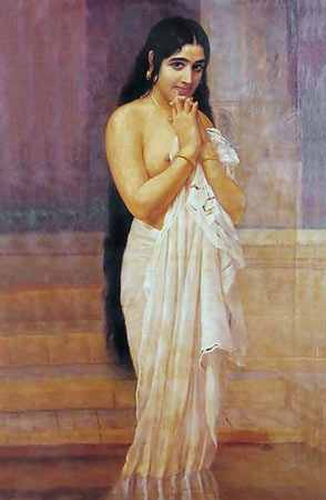 iii) “Lady after her bath”: This stunning painting has a dream-like quality, as if the beauty of the girl is an ideal. Her proportions are accurate, the folds of clothing accenting the decent amount of nudity. This is one of the most expressive paintings of Ravi Varma.