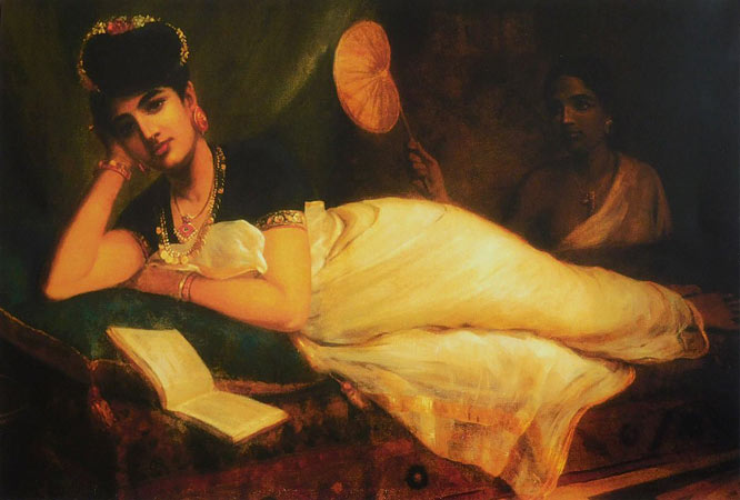 iv) “Romancing Couple”: This delicate subject is masterly composed by Ravi Varma. One could get that “warm and fuzzy feeling” whereby time passes by without the need for uttering any word. One shouldn’t miss the technique employed in depicting the pillar; the fine roundness and the straight edges are superb.
